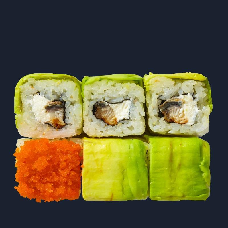 Angolna, rák, kívül uborka / avokádó, angolnaszósszal